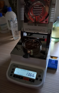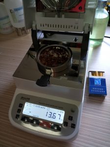 為了得到更精確穩(wěn)定的數(shù)據(jù)結(jié)果,在進(jìn)行第二次測試過程前先等待煙絲水分儀降溫,待儀器本身溫度降至40度以下時(shí),同樣取6克煙絲細(xì)條于不銹鋼托盤中,將煙絲細(xì)條平鋪均勻,這次我們把溫度設(shè)定在135℃,按“START”鍵開始測試,2分10秒后檢測結(jié)束,檢測數(shù)據(jù)顯示13.66%;
