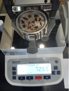用鑷子提取8克豬肉肉末,置于不銹鋼托盤中,用鑷子將牛肉肉末平鋪均勻,溫度設(shè)置145℃用儀器進(jìn)行加熱,檢測(cè)結(jié)束,檢測(cè)數(shù)據(jù)顯示72.65%;為了檢測(cè)儀器的精確性,待儀器溫度降至50℃以下時(shí)進(jìn)行第二次測(cè)量,用實(shí)驗(yàn)勺提取8克豬肉肉末,置于不銹鋼托盤中,用實(shí)驗(yàn)勺將面粉平鋪均勻,溫度設(shè)置145℃用儀器進(jìn)行加熱,后檢測(cè)結(jié)束,檢測(cè)數(shù)據(jù)顯示72.90%; 用實(shí)驗(yàn)勺提取8克豬肉肉末,置于不銹鋼托盤中,用實(shí)驗(yàn)勺將豬肉平鋪均勻,溫度設(shè)置150℃用儀器進(jìn)行加熱后檢測(cè)結(jié)束,檢測(cè)數(shù)據(jù)顯示72.82%。實(shí)驗(yàn)結(jié)果所得數(shù)值較為準(zhǔn)確,儀器檢測(cè)精度較高。