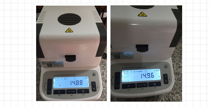 4、測試結(jié)束后得出第二組數(shù)據(jù),顯示樣品的水分含量為14.96%;數(shù)據(jù)基本相同誤差僅為0.08%,表示測試結(jié)果可靠,可重復(fù)性好。