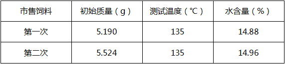 3、復(fù)位儀器,待儀器冷卻至40℃以下后,再取5.524g左右飼料均勻鋪在樣品盤上,重復(fù)上述測試步驟;